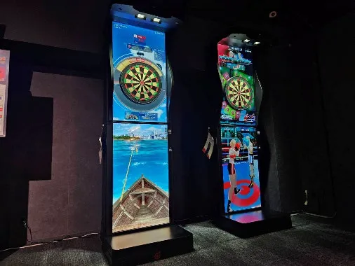 全面ディスプレイを搭載し、映像・音・演出のすべてに こだわった新感覚のダーツマシンが新登場! 躍動感あふれる映像美と多彩な没入感のある ダーツ体験を何度でも楽しめます!