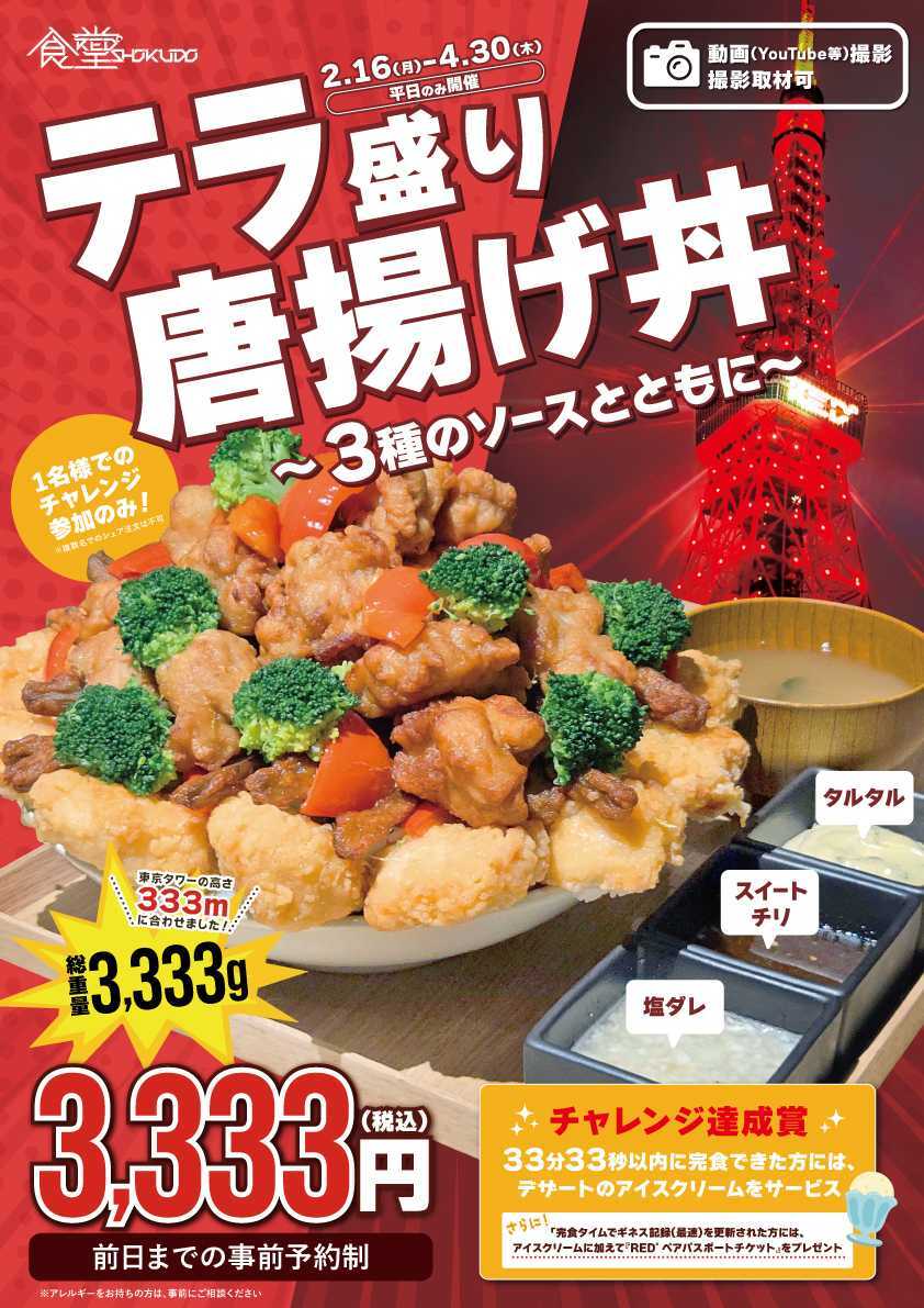 【東京タワーフットタウン1階「RED° SHOKUDO」】「RED° SHOKUDO」では、2026年2月16日(月)より、大人気ボリュームメニューの第三弾として、東京タワーの高さ333mにちなんだ総重量3,333gの超大盛りメニュー「テラ盛り唐揚げ丼 ~3種のソースとともに~」の販売を開始します。